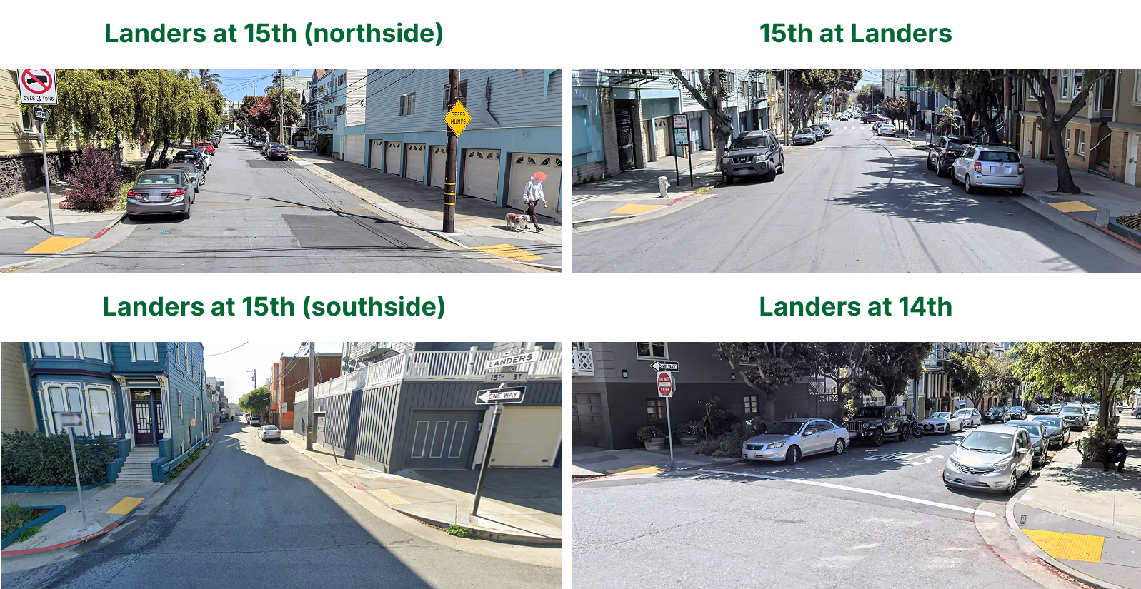 The crosswalks on Landers Street and on 15th Street at Landers are not painted (aka “unmarked”), making it more dangerous to cross the street, especially for children, families, seniors, and people with disabilities. Painting these crosswalks will make it safer for people to cross the street.